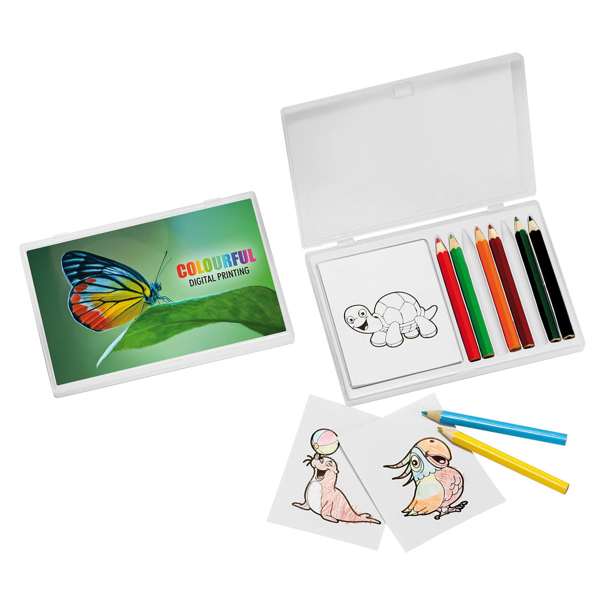 8 Buntstifte und 12 Malvorlagen in Box mit transparentem Deckel