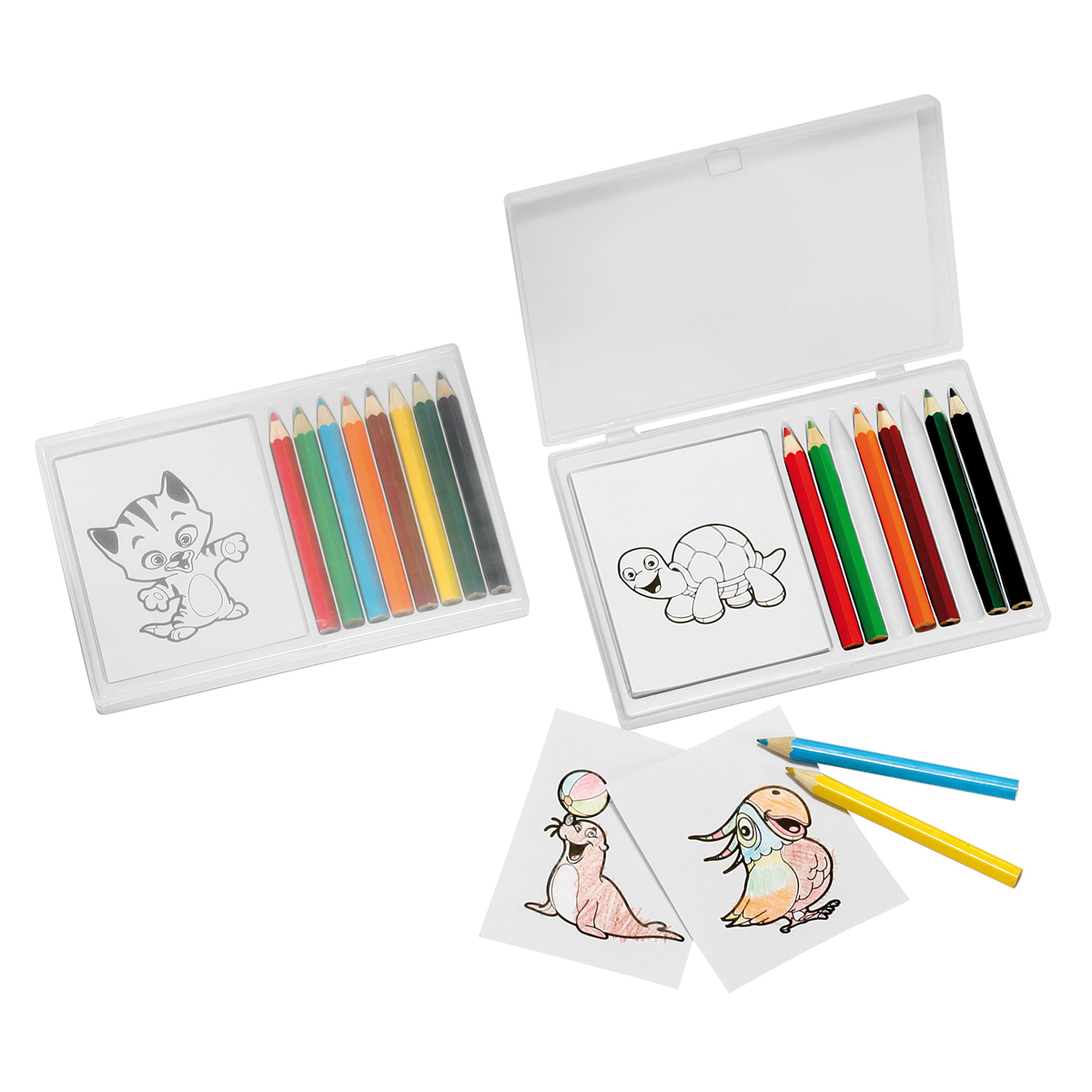 Grundfarbe: weiß; Zusatzfarbe: transparent 8 Buntstifte und 12 Malvorlagen in Box mit transparentem Deckel