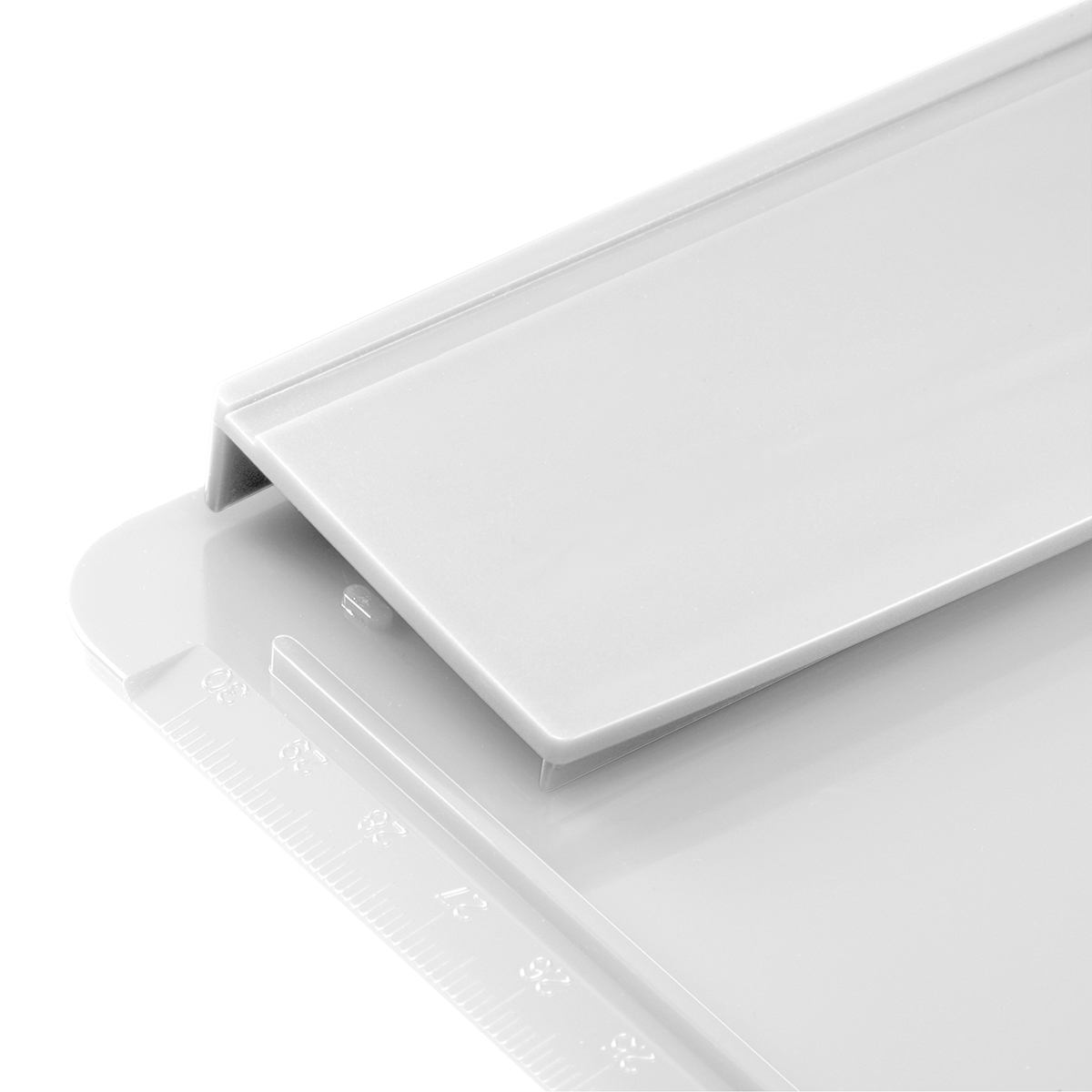 Platte: weiß; Leiste: weiß mit vertiefter Stiftehalterung, seitl. Anschlag, 30 cm Skala und 4 Filzpunkten auf der Rückseite