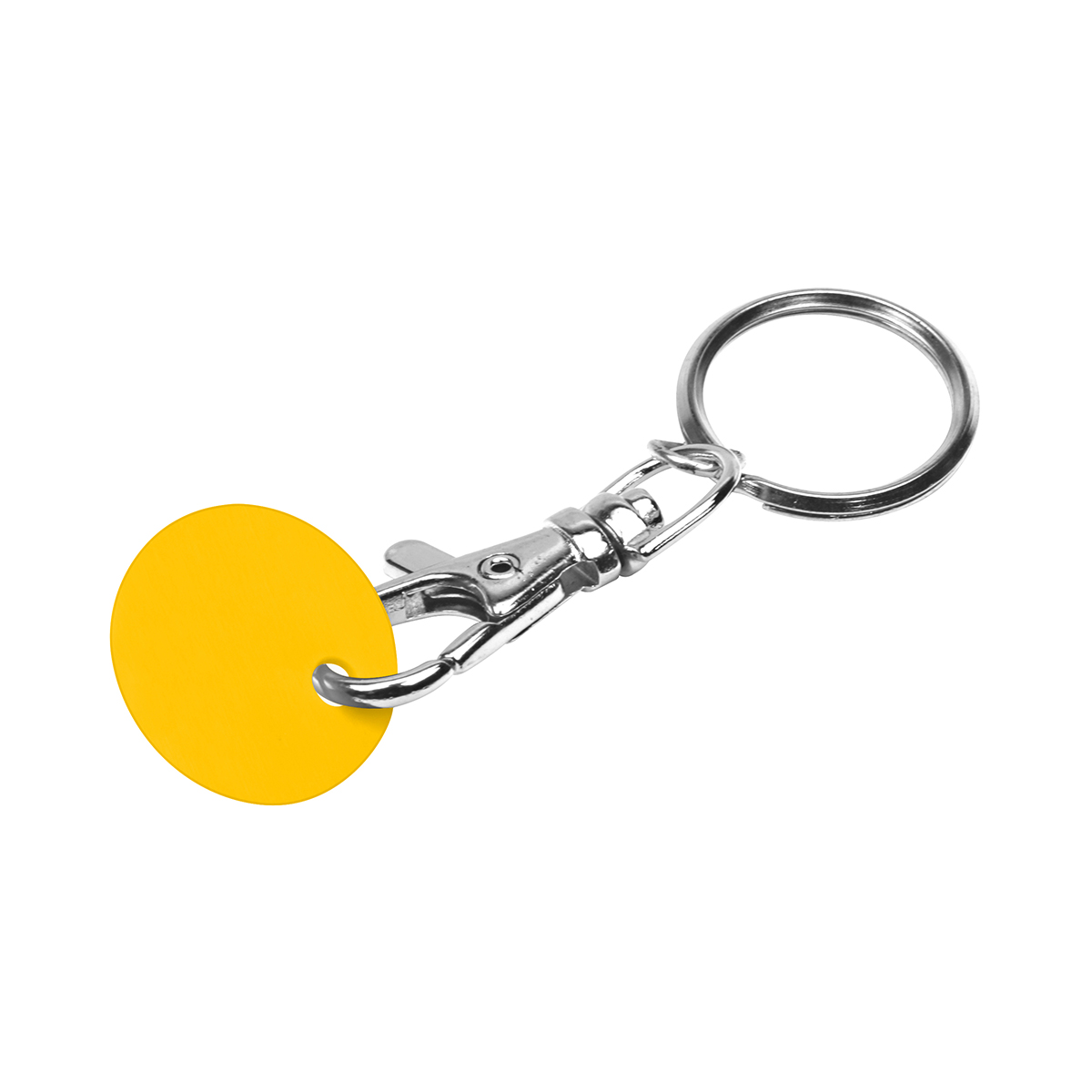 Karabiner: silber; Chip: gelb mit Kunststoff-1€-Chip