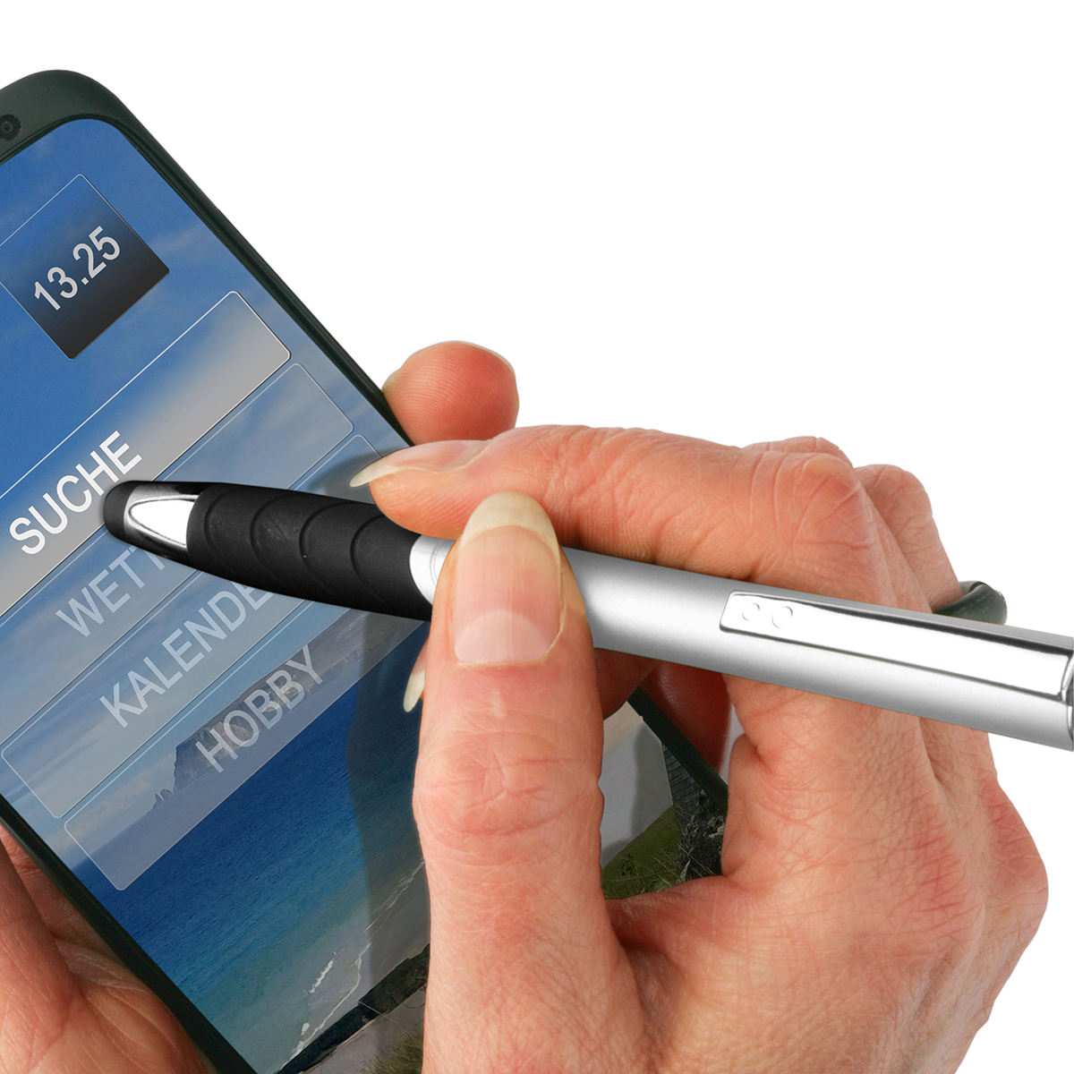 Grundfarbe: silber; Zusatzfarbe: schwarz mit Gummispitze und Softgripzone, Mine X-20, blau schreibend nur Abverkauf, keine Nachbestellung