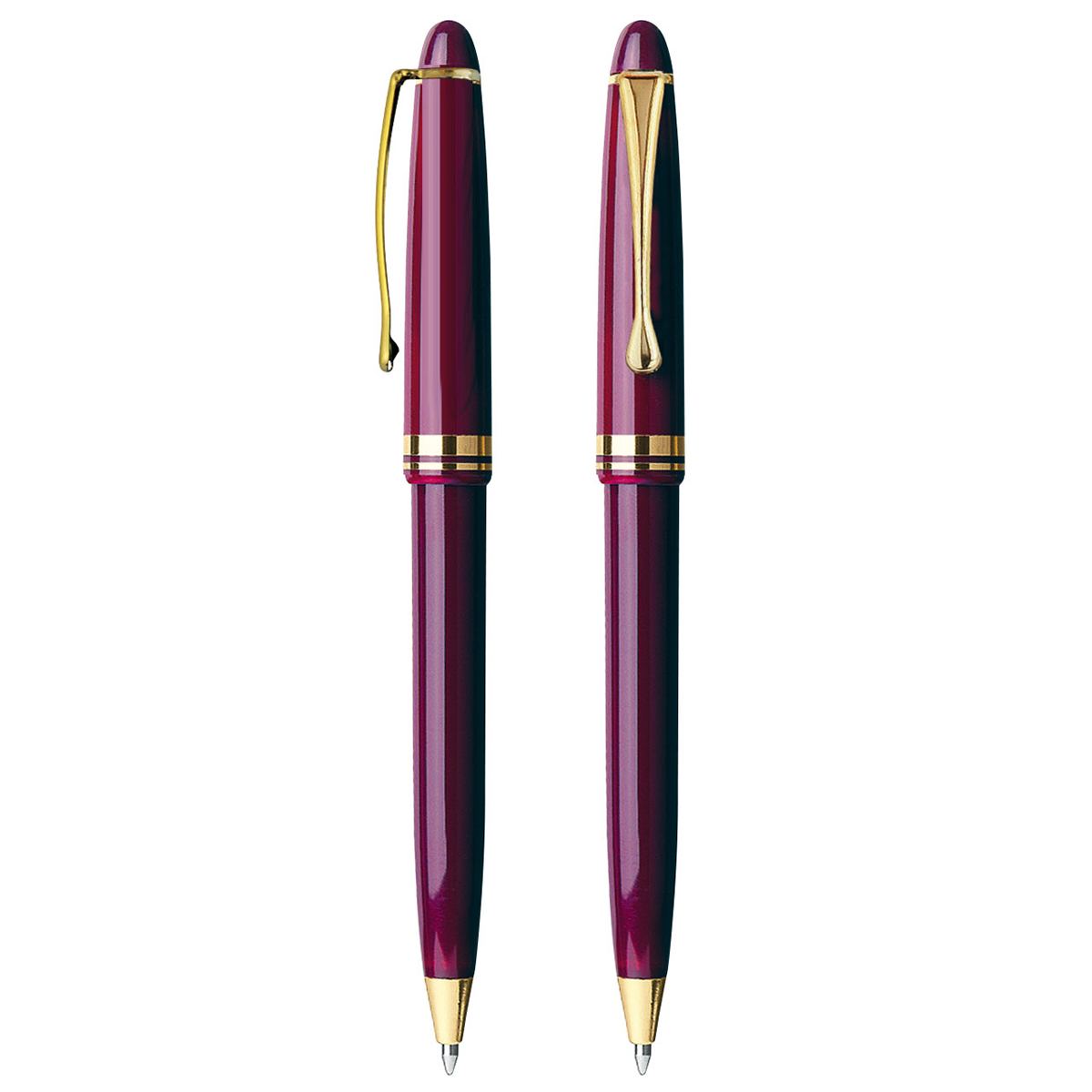 Grundfarbe: bordeaux; Zusatzfarbe: gold Clip, Spitze und Dekor gold- bzw. silberfarben, Großraummine, blau schreibend