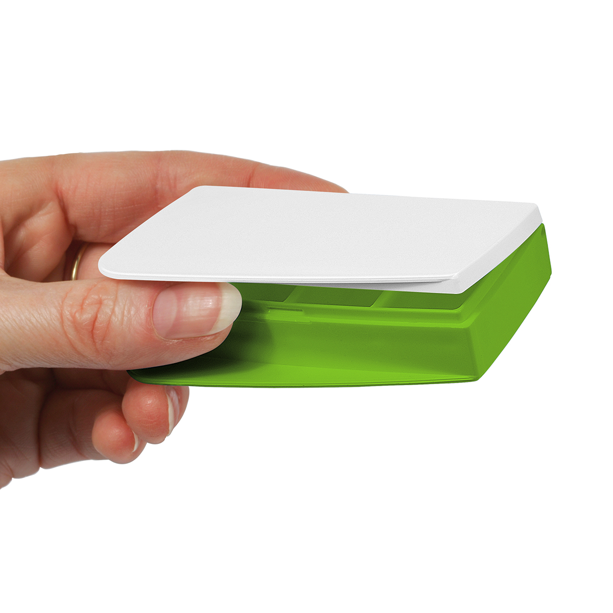 Oberteil: weiß; Unterteil: hellgrün 4 Fächer mit sprachunabhängigen Piktogrammen, sehr leichtes Öffnen, auch bei Mobilitäts-Einschränkung